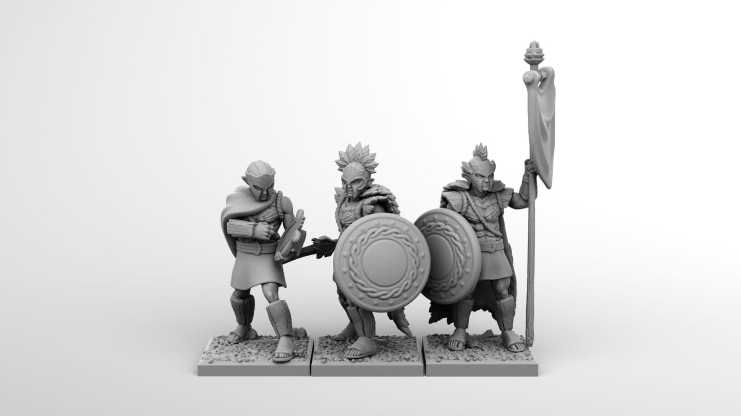 Grupo de mando de elfos silenos, fantásticas miniaturas con estilo griego
